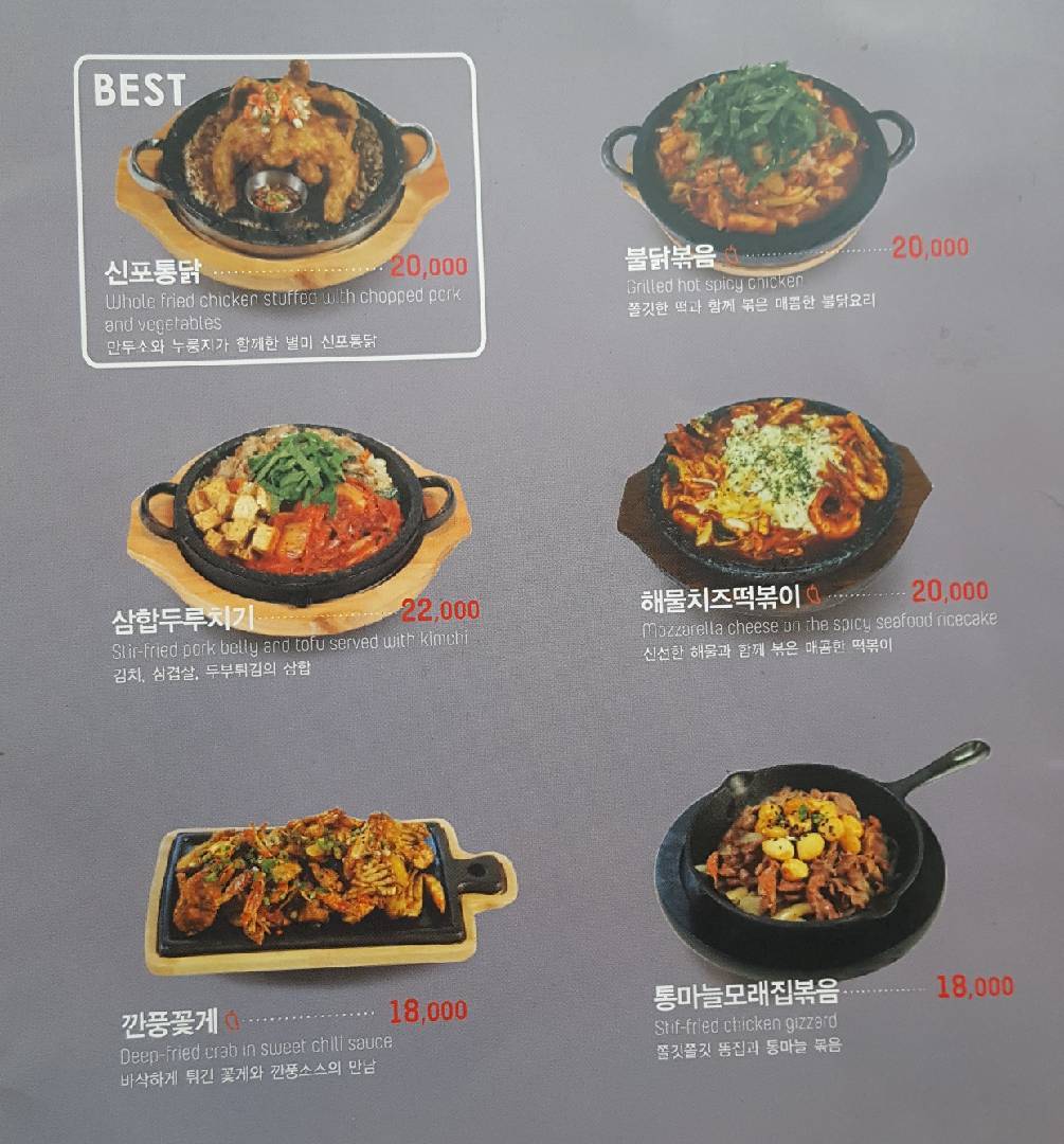 신포통닭 Sinpo Chicken 20,000won 만두소와 누룽지가 함께한 별미 신포통닭 Special chicken with the stuffing and scorched rice 불닭볶음 Spicy Stir-fried Chicken 20,000won 쫄깃한 떡과 함께 볶은 매콤한 불닭요리 Spicy stir-fried chicken with chewy rice cake 삼합두루치기 Stir-fried Pork Belly, Tofu and Kimchi 22,000won 김치, 삼겹살, 두부튀김의 삼합 Grilled pork belly and deep-fried tofu served with kimchi 해물치즈떡볶이 Stir-fried Rice Cake with Seafood and Cheese 20,000won 신선한 해물과 함께 볶은 매콤한 떡볶이 Spicy stir-fried rice cake with fresh seafood 깐풍꽃게 Deep-fried Blue Crab in Hot Pepper Sauce 18,000won 바삭하게 튀긴 꽃게와 깐풍소스의 만남 A combination of deep-fried blue crab and hot pepper sauce 통마늘모래집볶음 Stir-fried Chicken Gizzard with Garlic 18,000won 쫄깃쫄깃 똥집과 통마늘 볶음 Stir-fried chewy chicken gizzard and garlic